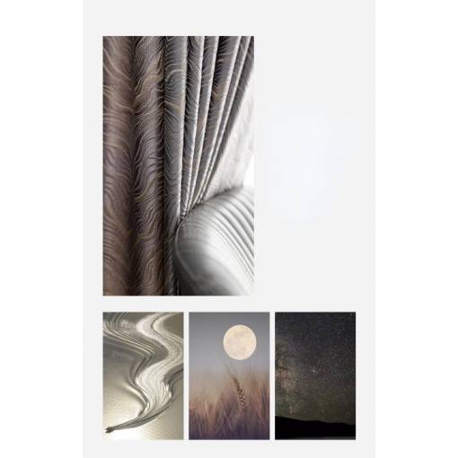 Tento závěs z vysoce kvalitní tkaniny vyniká nádherným vzorem, který evokuje překrývající se horské hřebeny, a dodává místnosti uklidňující atmosféru přírody.