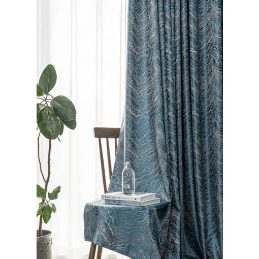 Tento závěs z vysoce kvalitní tkaniny vyniká nádherným vzorem, který evokuje překrývající se horské hřebeny, a dodává místnosti uklidňující atmosféru přírody.