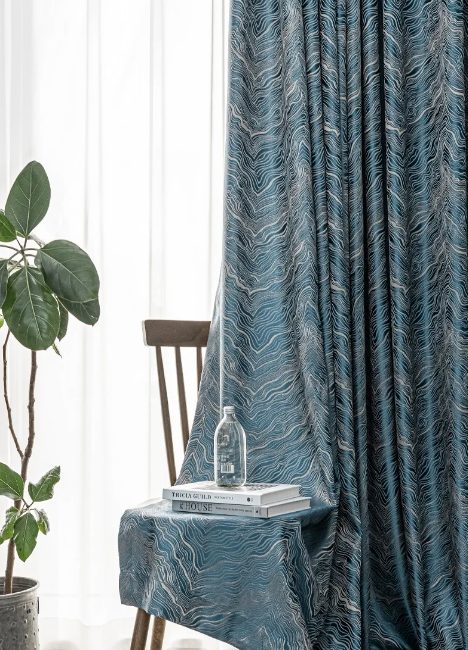 Tento závěs z vysoce kvalitní tkaniny vyniká nádherným vzorem, který evokuje překrývající se horské hřebeny, a dodává místnosti uklidňující atmosféru přírody.