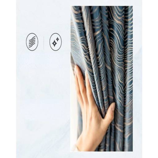 Tento závěs z vysoce kvalitní tkaniny vyniká nádherným vzorem, který evokuje překrývající se horské hřebeny, a dodává místnosti uklidňující atmosféru přírody.