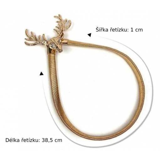 Tento pozlacený řetízek, dlouhý 38 cm, se vyznačuje zdobeným prvkem, který slouží jako upínání.